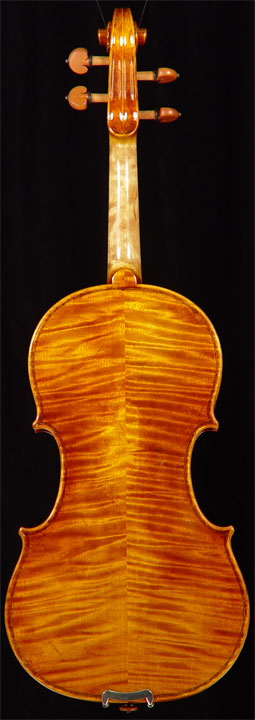 Visually striking, and tonally superior, for the artist player looking for an exceptional instrument. Available to either Guarneri or Stradivari model, and made with highly figured maple and choice spruce. Great workmanship, with rich and carrying sound. The Guarneri model has a slightly darker tone. Fine quality varnish and fittings.