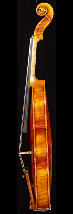 Visually striking, and tonally superior, for the artist player looking for an exceptional instrument. Available to either Guarneri or Stradivari model, and made with highly figured maple and choice spruce. Great workmanship, with rich and carrying sound. The Guarneri model has a slightly darker tone. Fine quality varnish and fittings.